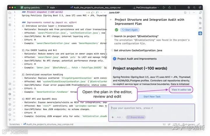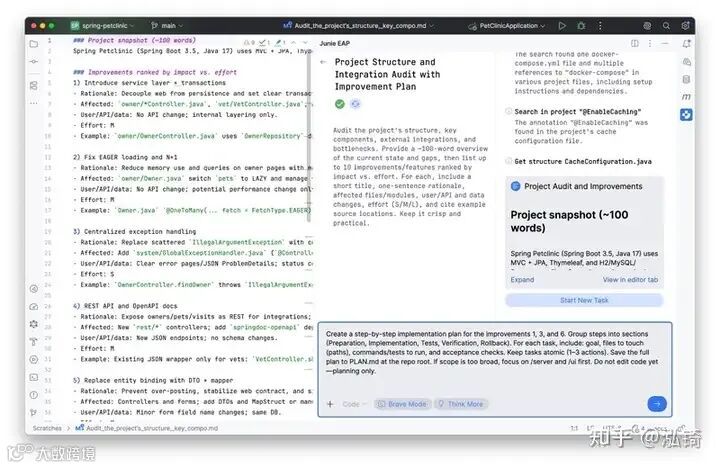一旦任务交给 Junie,它会扫描结构和集成,并识别瓶颈。然后,它会强制任务根据改进的影响和投入对改进进行排序。
