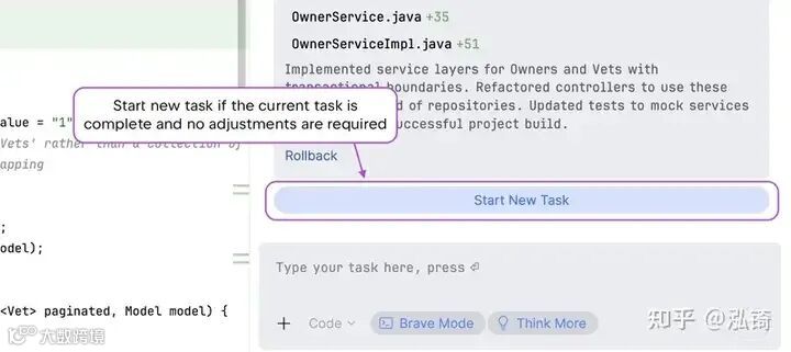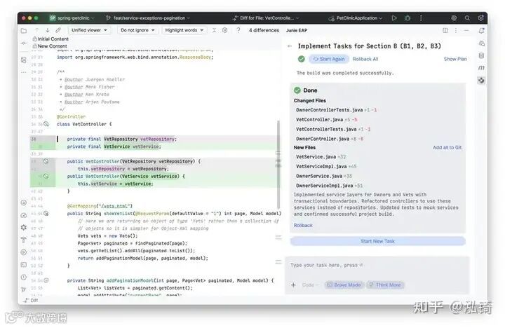 代码模式用于操作。Junie 会建议编辑、运行命令并显示差异以供您审阅。您可以掌控一切:接受好的,拒绝不好的,然后继续前进。如果您已经有计划,并且希望稳步推进,并设置检查点而不是意外情况,那么此模式最有效。
