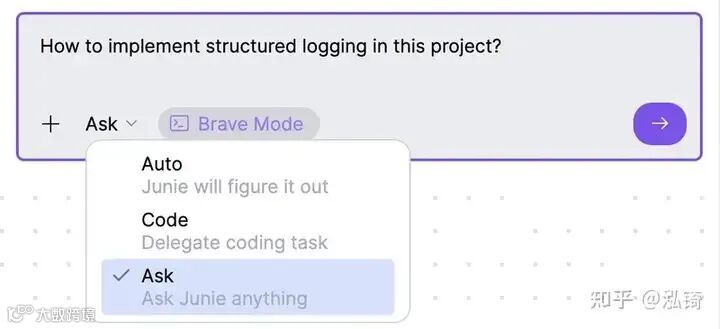 你首先要决定的是模式。“询问模式”主要用于阅读和解释,尽管代理仍可能更改文件。Junie 可以探索你的项目、跟踪依赖关系并概述计划,但它无法触及单个文件。