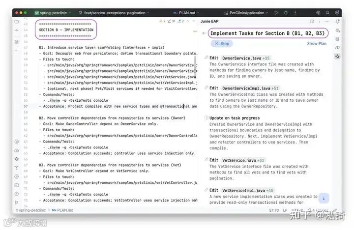 Junie 起草了一份有序的计划,并将其写入仓库根目录下的 PLAN.md 文件。像对待代码一样对待该文件:提交、审核,必要时在拉取请求中进行修改。清晰可见的计划可以降低风险,因为每个人都能看到具体步骤,而不仅仅是最终的差异。