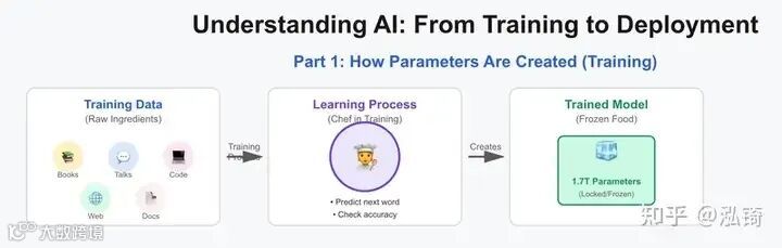 参数并非训练数据,而是模型从这些数据中学习到的东西。你可以把它们想象成厨师的技能、经验和直觉。