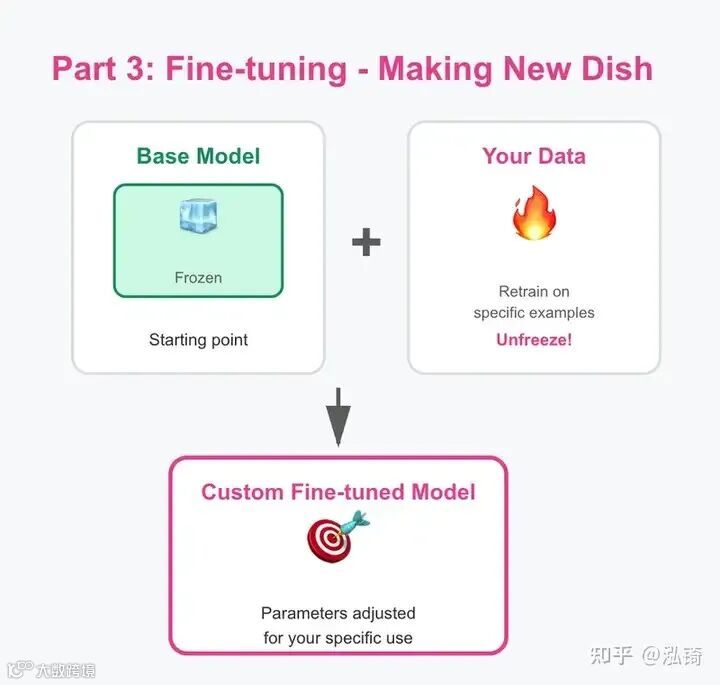 两种方法都基于相同的理念:预训练模型(拥有数万亿个参数)就像是你的起点,你的起点就像是冷冻食品。但根据你的需求,你可以围绕它添加新鲜食材(RAG),或者将其改造成新的东西(微调)。