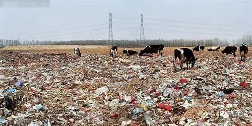 在标注着北京市昌平区小汤山镇官牛坊(40°09′06″N ,116°22′14″E)的照片中,一座大型垃圾场就在小河边。以远处电线杆为背景,牛群正在垃圾场内寻找食物。那些黑白相间的奶牛来自附近的养殖场,它们每天在受到垃圾污染的小河里喝水,喝足水之后再到垃圾场美餐一顿。在照片的背后,这些垃圾堆上的奶牛们产出的奶可能正从养殖场运出,分别被送到各大卖场,最后被生活在这个城市的人喝下。