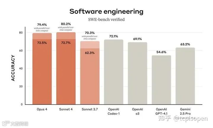 Claude Opus 4 在 SWE-bench 上领先,得分为 72.5%,通过并行测试时间计算最高可达到 79.4%。