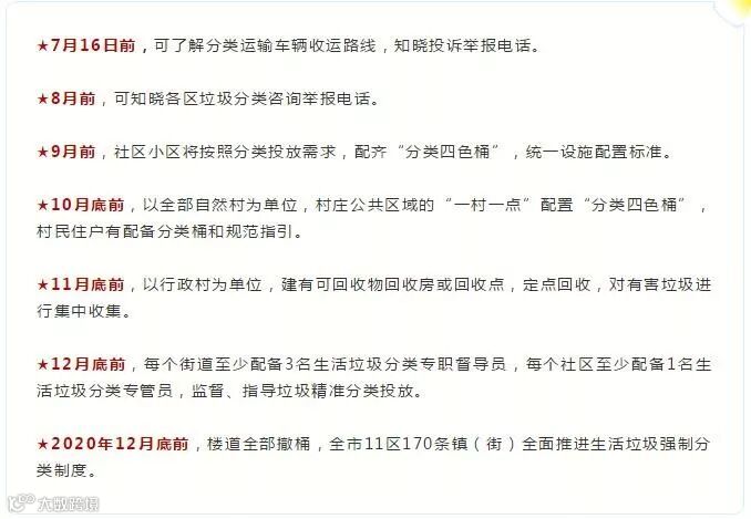 根据时间表,今年内,广州实现辖区党政机关等公共机构生活垃圾强制分类全覆盖,物业小区全覆盖,分类收运线路全覆盖,资源回收、有害垃圾分类收集全覆盖,社会动员全覆盖。2020年底前,广州要建成完善的生活垃圾分类处理系统,全市11区170条镇(街)全面推进生活垃圾强制分类制度。