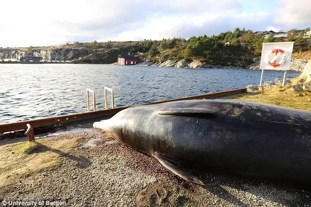 2月初,人们在挪威海滩发现一头死去的鲸鱼。