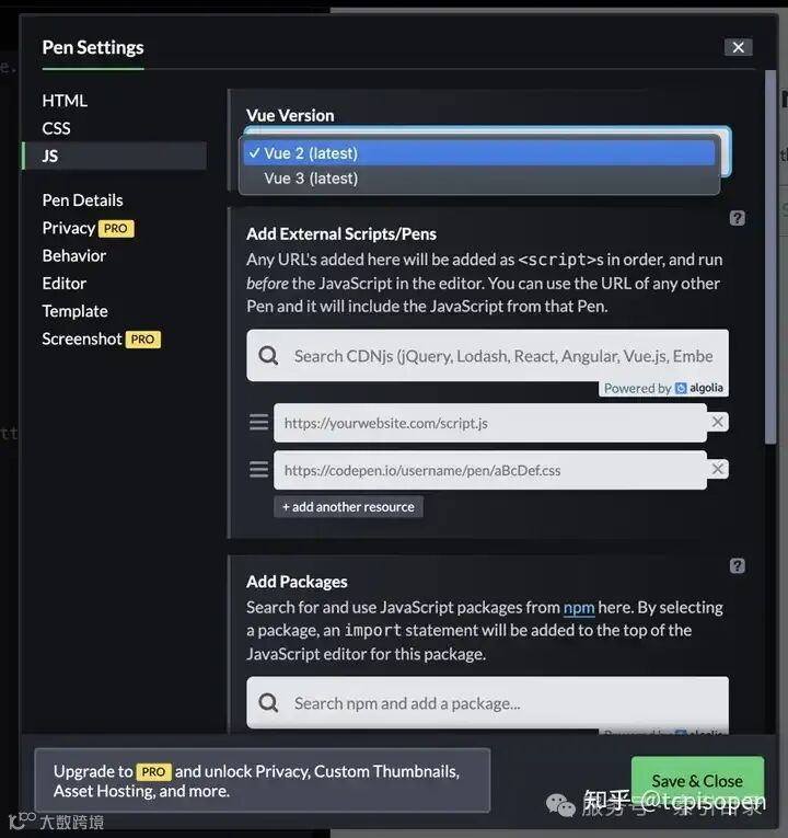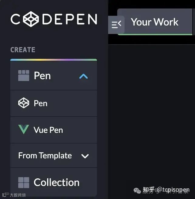 最简单的入门方法是使用 CodePen 的内置 Vue 模板。从左侧菜单中,单击菜单Pen以打开选项,然后选择Vue Pen。