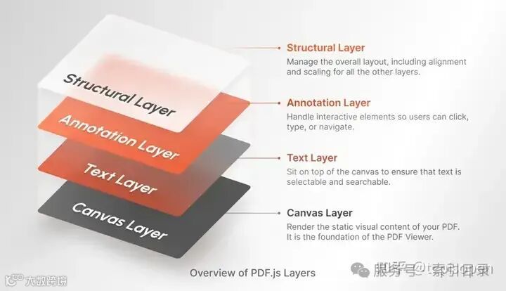 在深入研究之前,我们先来快速了解一下 PDF.js 中的四个主要层。每个层处理渲染或用户交互的特定方面: