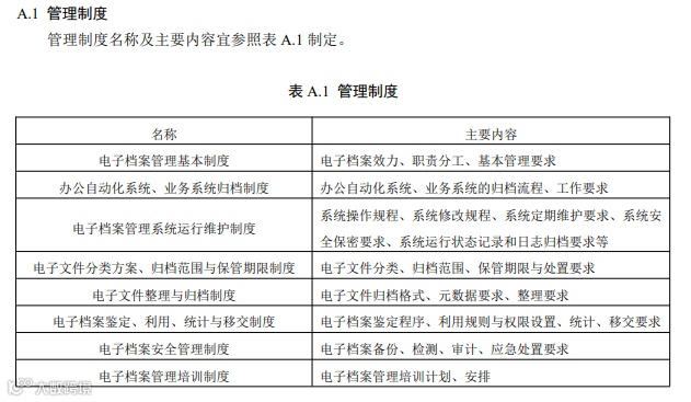 管理制度(见附录 A A.1)应规定或明确电子档案效力和各部门职责分工,办公自动化系统、 业务系统、电子档案管理系统管理流程和运行维护要求,电子文件分类方案、归档范围与保管期限, 电子文件整理、归档要求,电子档案鉴定、利用、统计与移交要求,电子档案安全管理要求,电子 档案管理培训要求等。管理制度可以单独或合并制定,也可以制定包含所有内容的统一制度。