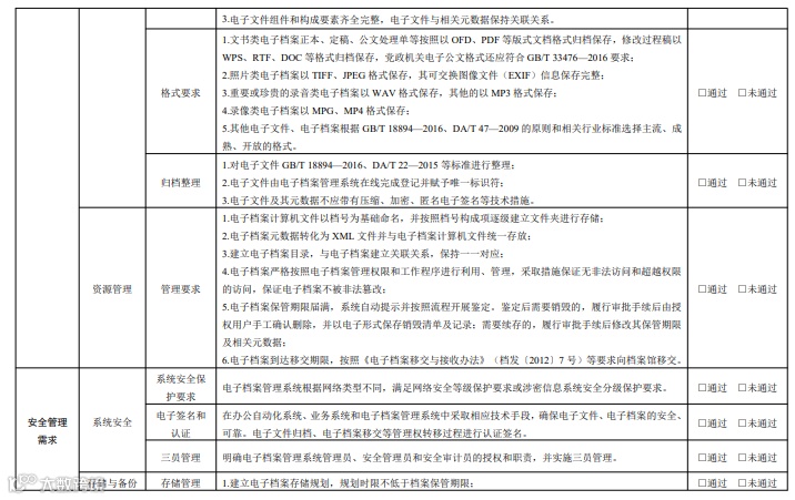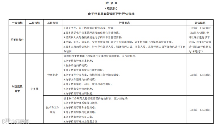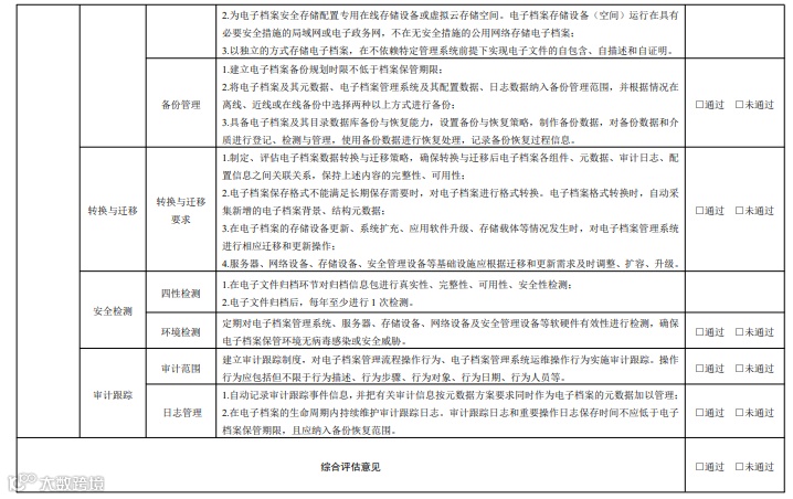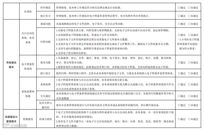 所有三级指标评估结果为“通过”视为达到本文件要求,通过可行性评估,可开展电子档案 单套管理。