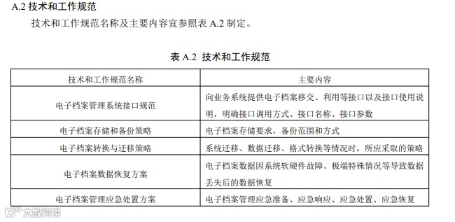 技术和工作规范(见附录 A A.2)应与 6.2 管理制度协调配合,明确电子档案管理系统接口规 范、电子档案存储和备份策略、电子档案转换与迁移策略、电子档案数据恢复方案、电子档案管理 6 应急处置方案。