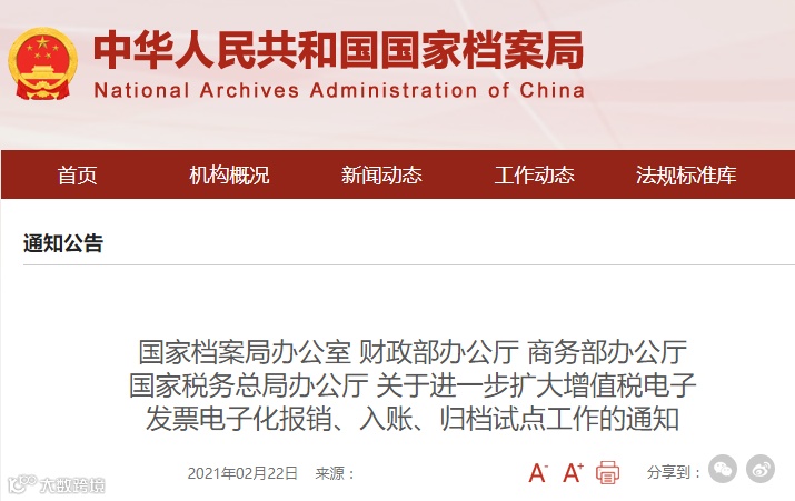 为贯彻2021年中央经济工作会议精神,落实《税务总局等十三部门关于推进纳税便利化改革优化税收营商环境若干措施的通知》要求,加快增值税电子发票应用和推广实施工作,降低企业交易成本,推进“六保”“六稳”工作,助力国家数字经济发展,按照国务院有关要求,在前两批试点的基础上,国家档案局会同财政部、商务部、国家税务总局拟再选定一批单位开展增值税电子发票电子化报销、入账、归档试点工作,形成示范效应,进一步完善数字经济发展所需的制度和标准规范,现将有关事项通知如下。