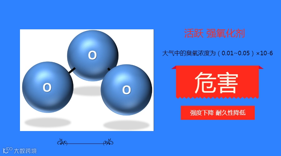 臭氧的化学性质活跃,是一种强氧化剂。在空气中还会分解成氧气和原子态氧,并放出能量: