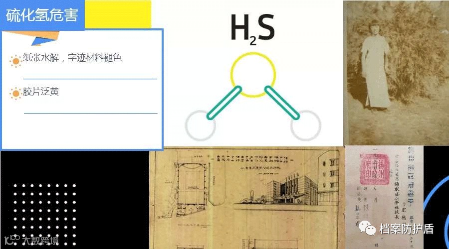 硫化氢对胶片的危害很大,它除了能够离解出H+危害档案外,还能够与胶片中的银发生反应,生成黄色的硫化银,使得胶片泛黄。其反应式为:
