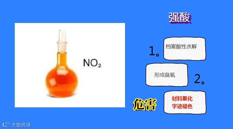 硝酸是强酸,可以促进档案的酸性水解;同时,硝酸是强氧化剂,易使档案载体材料氧化、字迹退色,增强了对档案的破坏作用。因此,二氧化氨既是酸性有害气体,又是氧化性有害气体。