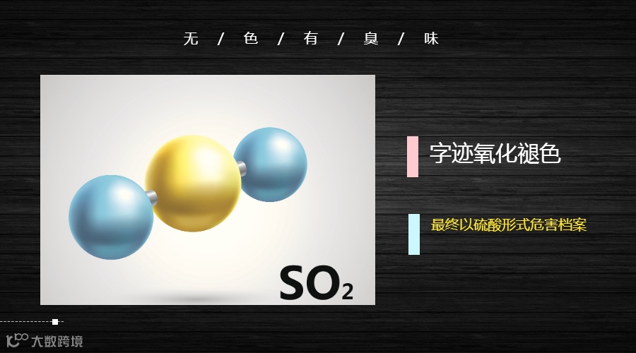 在以上变化过程中,表现为酸性的有亚硫酸(H2SO3)、硫酸(H2SO4)。其中,亚硫酸性质不稳定,存在时间较短。它除了酸性破坏作用外,还具有氧化性,能促使字迹氧化退色。硫酸是二氧化硫危害档案的最终形式,它存在时间长,不通过去酸处理会永远保留在档案中。