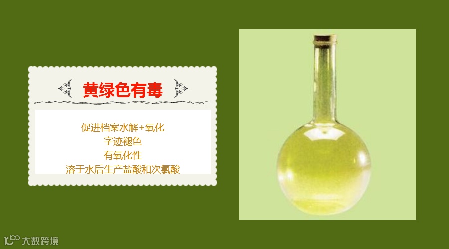 氯气在潮湿的空气中容易生成气溶胶状的盐酸雾粒子,这种酸雾有很大的腐蚀性,促进档案的水解和氧化作用,促使字迹退色。氯气可溶于水,溶于水后生成盐酸和次氯酸。后者可以发生分解反应,释放出原子态氧: