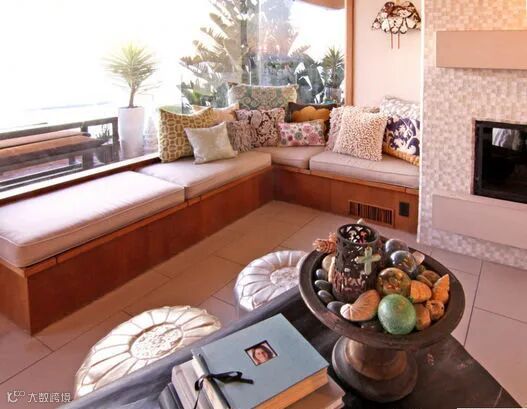 阳台如果邻接客厅,可以改为榻榻米沙发。在增加客厅面积的同时使客厅拥有一个明亮宽敞的观景区,舒适而温馨,可以方便的享受午后日光。