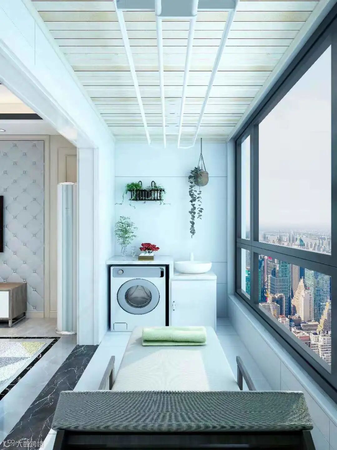 洗衣机不一定要放在卫生间,如果你家阳台有足够的宽度放下洗衣机,那么洗衣、烘干、晾晒都可以在阳台一处完成。这也是对阳台地面空间最常见的利用方式。