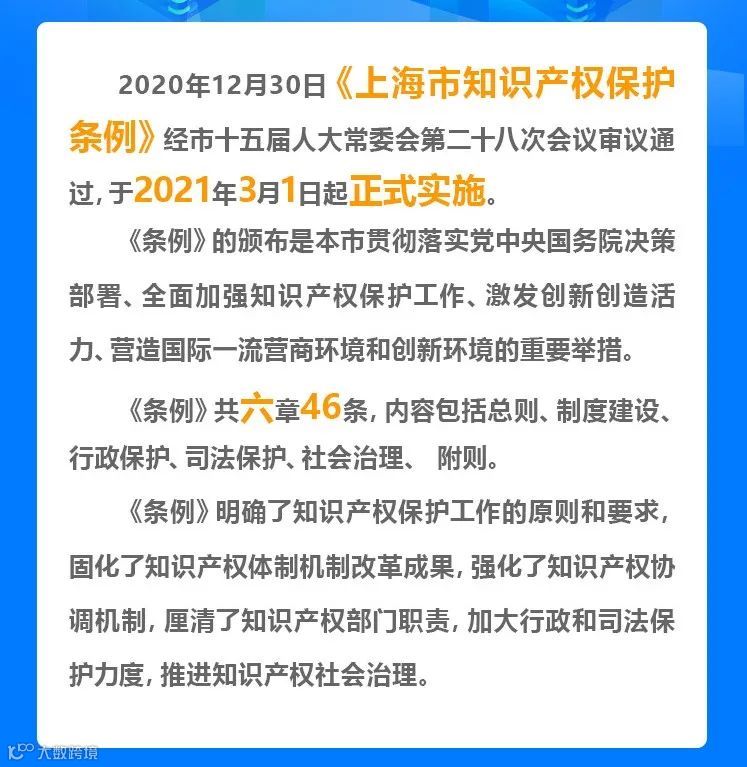 上海市十五届人大常委会第二十八次会议表决通过的《上海市知识产权保护条例》将于3月1日起施行。《条例》明确了知识产权保护工作的原则和要求,固化了知识产权体制机制改革成果,强化了知识产权协调机制,厘清了知识产权部门职责。《条例》还规定,加大行政和司法保护力度,推进知识产权社会治理。