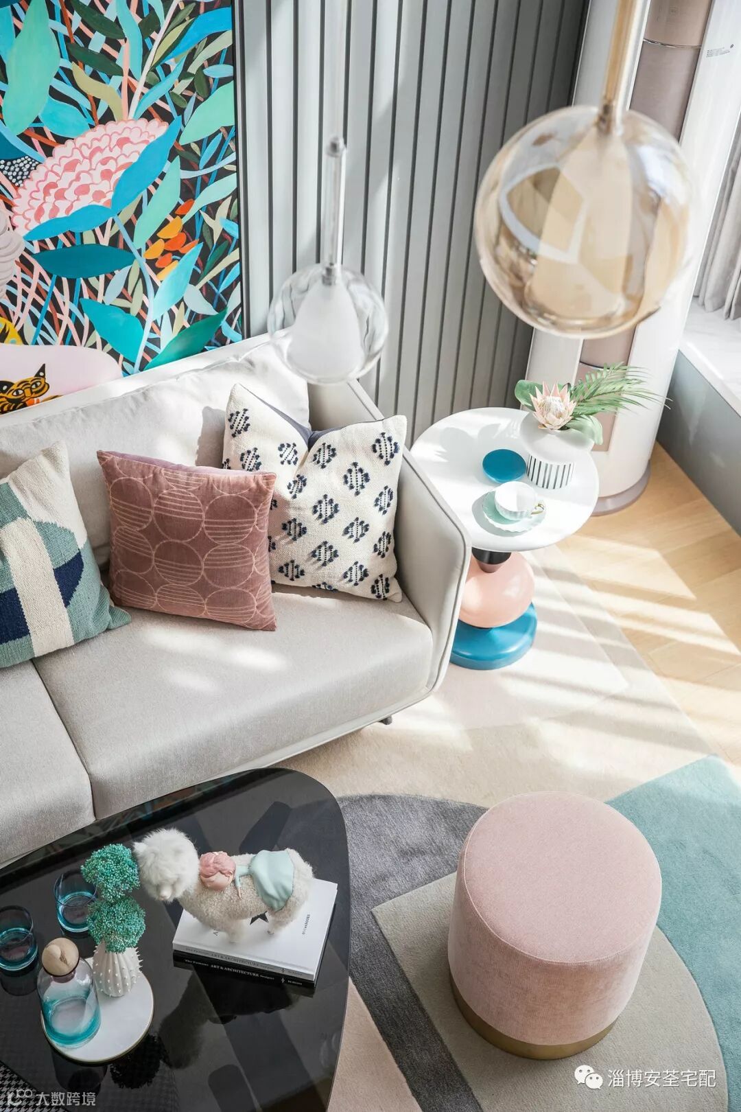 为了完成这次空间想象,出挑烂漫的马卡龙色是60㎡空间的格调塑造者与视觉氛围营造者。设计师在以白色为主色调的每一组色彩配比中,结合每个空间的功能性质,促使同一色系之间的不同色阶平衡过渡,而大面积落地窗的设计,为室内引入了诗意浪漫的自然光景同时,与简洁流畅的布局结构,共同构成柔美舒适的生活场域。