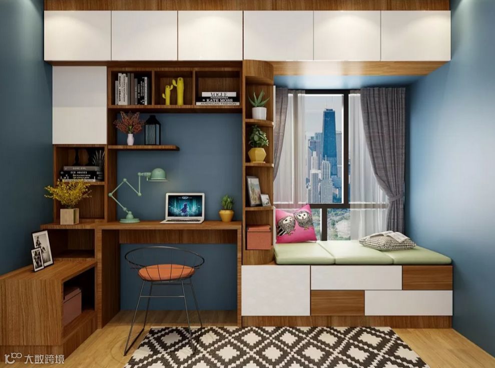▲飘窗+整体柜+书桌:按照屋内空间定制的组合柜,在满足房间多元化的同时,还能让储物空间达到翻倍的效果。