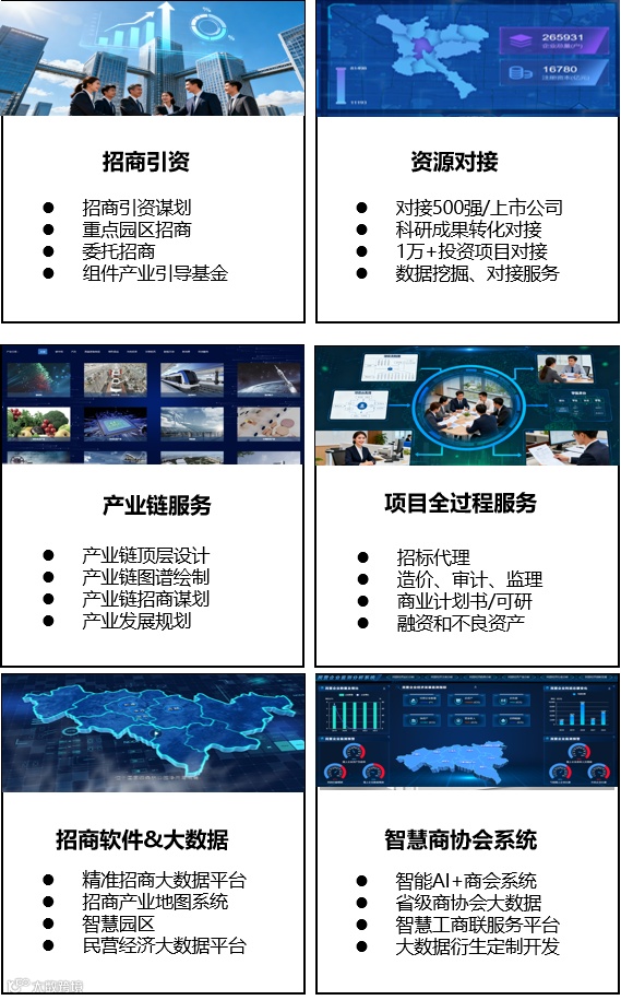 商企通招商引资招才引智大数据平台,分析研究了300多个产业图谱、上下游产业链,从全国1.5亿户市场主体中筛选分析出10万+优质企业(含上市公司、各国家各省市各行业500强企业)的投资方向,累积成一万多个投资信息的项目库,结合3000所高校和科研院所的2000万+科研成果,为城市强链补链招商引智助力。