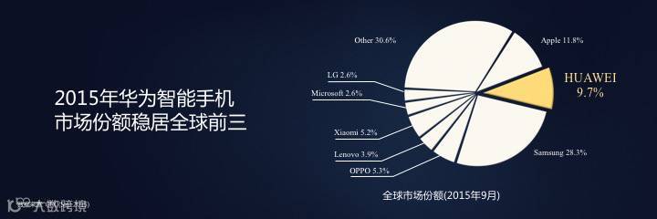根据GFK 2015年9月的数据显示,华为全球智能手机市场份额为9.7%,稳居全球前3,并且拉开了与第二阵营的差距。在部分欧洲国家,华为在400-500欧元档位的高端智能手机市场份额进步明显。