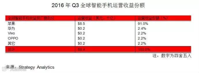 根据市场研究公司Strategy Analytics的最新报告显示,全球智能手机运营利润在2016年第3季度达到94亿美元,苹果的收益份额占全球总收益的91%,华为、vivo和OPPO的收益在本季度分列2、3、4名。