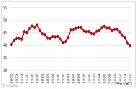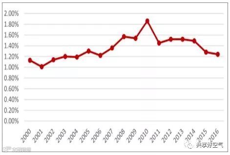 我国工业增加值占GDP比重在39%-48%区间。我国已经历了30多年的工业高速发展期,根据国家“十三五”规划要求,经济结构方面将由工业主导型的经济转向服务业主导型的经济,未来我国将进一步调降工业增加值占GDP比重。事实上,自2006年起工业占比就呈现波动下降趋势,由2006年的47.6%大幅下降到2016年的39.8%,下滑比例高达14%,其中2008-2010出现了第一次环保行业腾飞。虽然,工业增加值占GDP比重有望延续波动下滑趋势,但参考发达国家环保行业发展路径,经济环境仍足以支持行业高速发展。