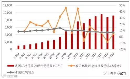 2000-2016年环保投入占GDP比重徘徊在1%-1.9%区间。2001-2010年我国经历了环保行业的第一次飞速发展,2010年环保投入占GDP比重约1.86%,此后便出现波动性下滑,到2016年比重仅为1.24%左右。根据发达国家经验,环保投入占GDP比重在1-1.5%区间时,才有可能遏制环境污染恶化的趋势,比重达到2-3%时,才有改善环境质量的可能。可见,我国尚未走出控制环境污染总量继续恶化的阶段,未来行业发展空间仍然巨大。“十三五”规划明确提出,国家将以各项政策制度及环保督查行动等保证环保行业发展方向向改善环境质量转变,为我国环保产业进入全新的发展阶段奠定了制度规划基础。借鉴发达国家环保行业发展历程,预计2020年我国环保投入占GDP比重将超2%,同时,根据环保部环境规划院开发的《国家中长期环境经济预测模型系统》的预测结果来看,全国环境质量全面改善和生态系统的平衡要到2030年前后才能出现。