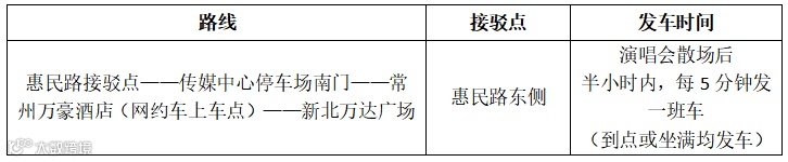 【散场】观众们可在惠民路接驳点乘坐免费接驳大巴,前往常州万豪酒店网约车上车点或传媒中心、新北万达等停车场。
