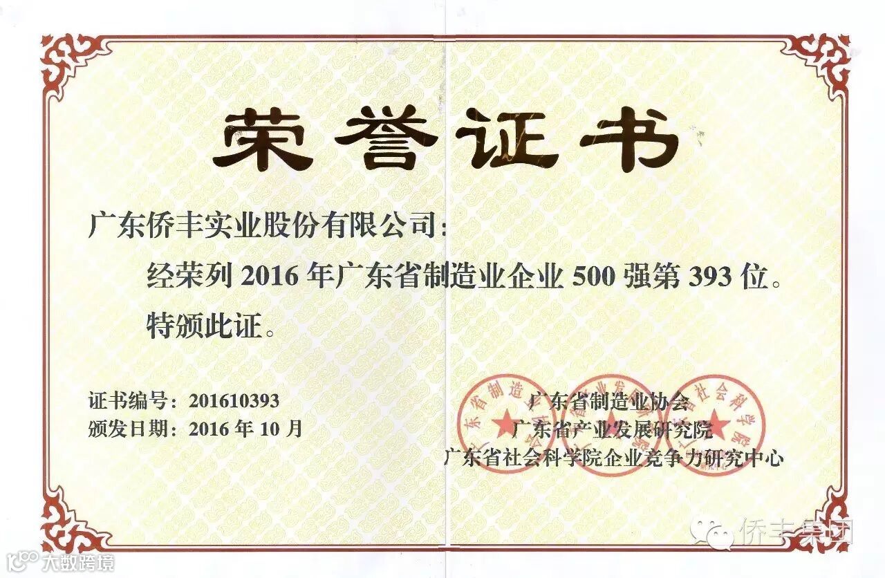 10月13日,以“广东制造业企业向高端化、智能化、绿色化战略发展”为主题的2016“广东省制造业发展年会暨广东省制造业500强企业峰会”在珠海召开。本次入选企业平均营业收入为54亿元,广东侨丰实业股份有限公司(本部)经评选入围2016年广东省制造业500强,名列393名。