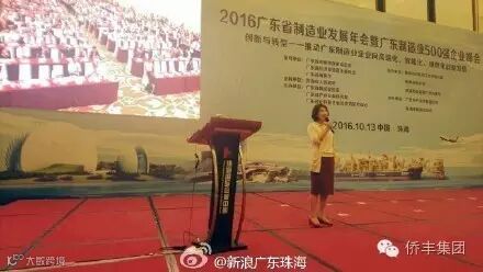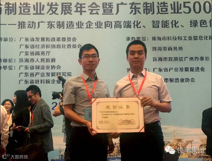 会上,广东省制造业协会发布了2016年广东省制造业500强企业研究报告,华为技术有限公司、正威国际集团有限公司继续蝉联广东省制造业500强一、二名,广州汽车工业集团有限公司则位列第三。上述三家企业均在《2916年世界500强企业》的上榜名单当中。其他制造业名企包括正威国际集团、立白集团、中兴通讯、中海壳牌、格兰仕集团、伟创力制造等,入选企业平均营业收入为54亿元,广东侨丰制造板块经评选名列393名,公司董事长助理李鑫渲代表公司出席峰会领取500强荣誉证书。