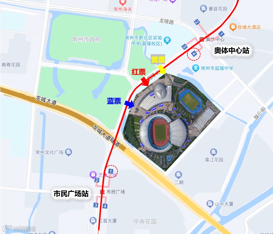 黄票(看台D)观众可乘坐地铁1号线到达奥体中心站,从4号口出,向南步行250m;