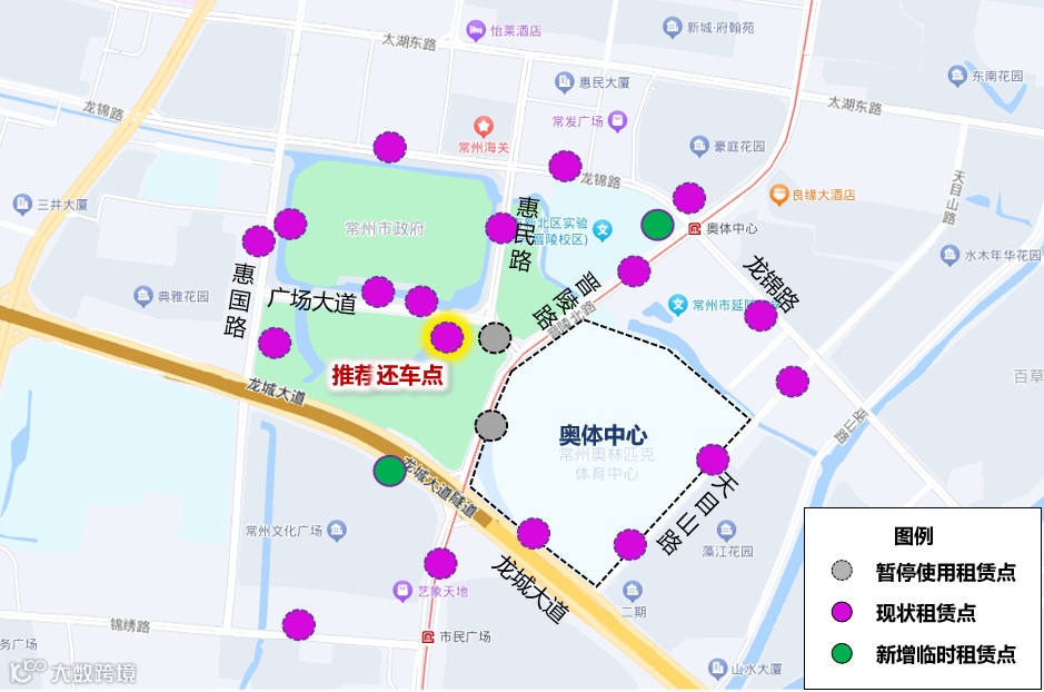 晋陵路龙城大道北侧100米、南侧150米共2处共享单车租赁点临时取消,为满足观众共享单车停取需求,新增以下2处临时租赁点: