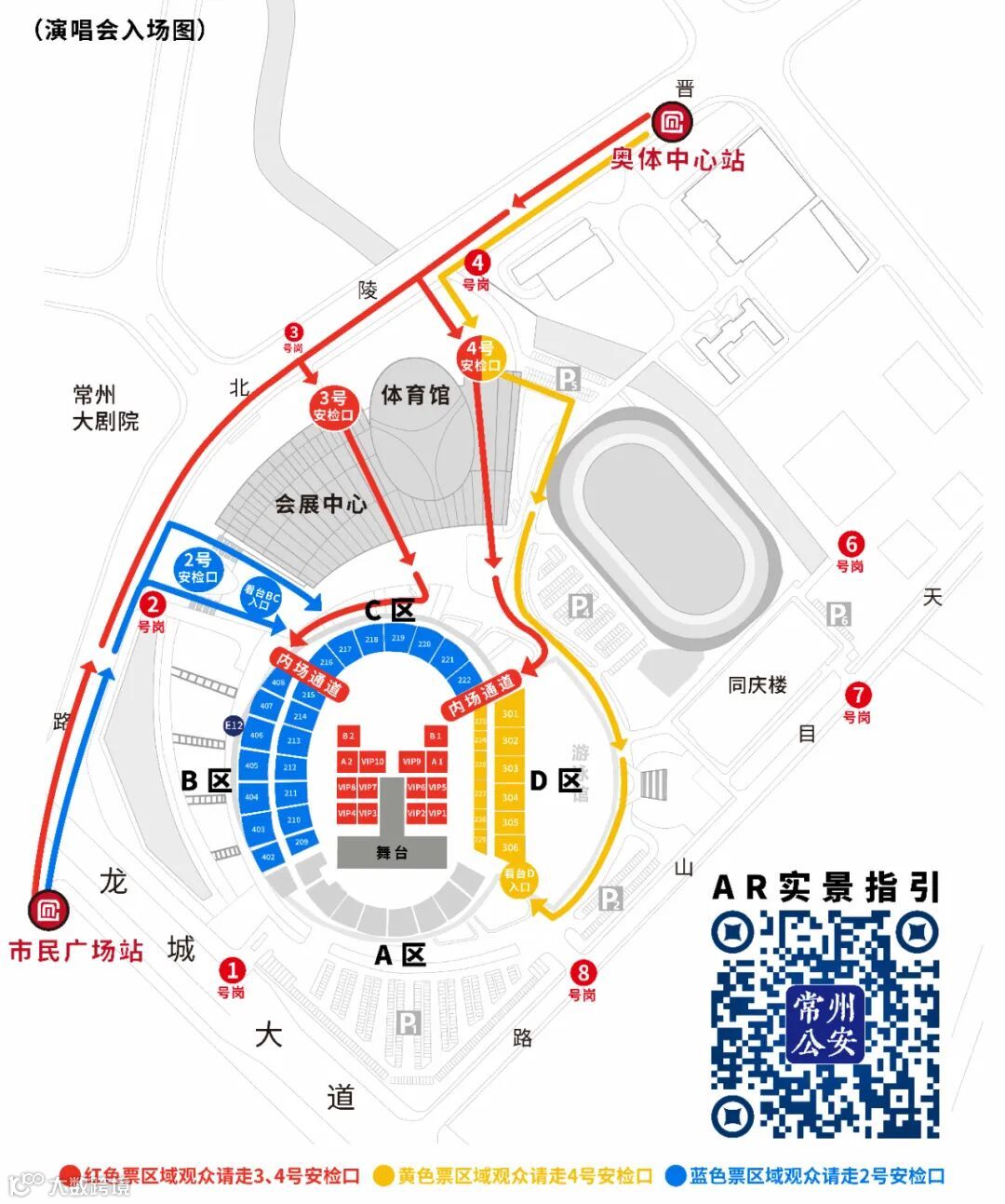 现场跟随对应票色指引即可快速入场。(点击票夹界面指引浏览线路和座位实景)。