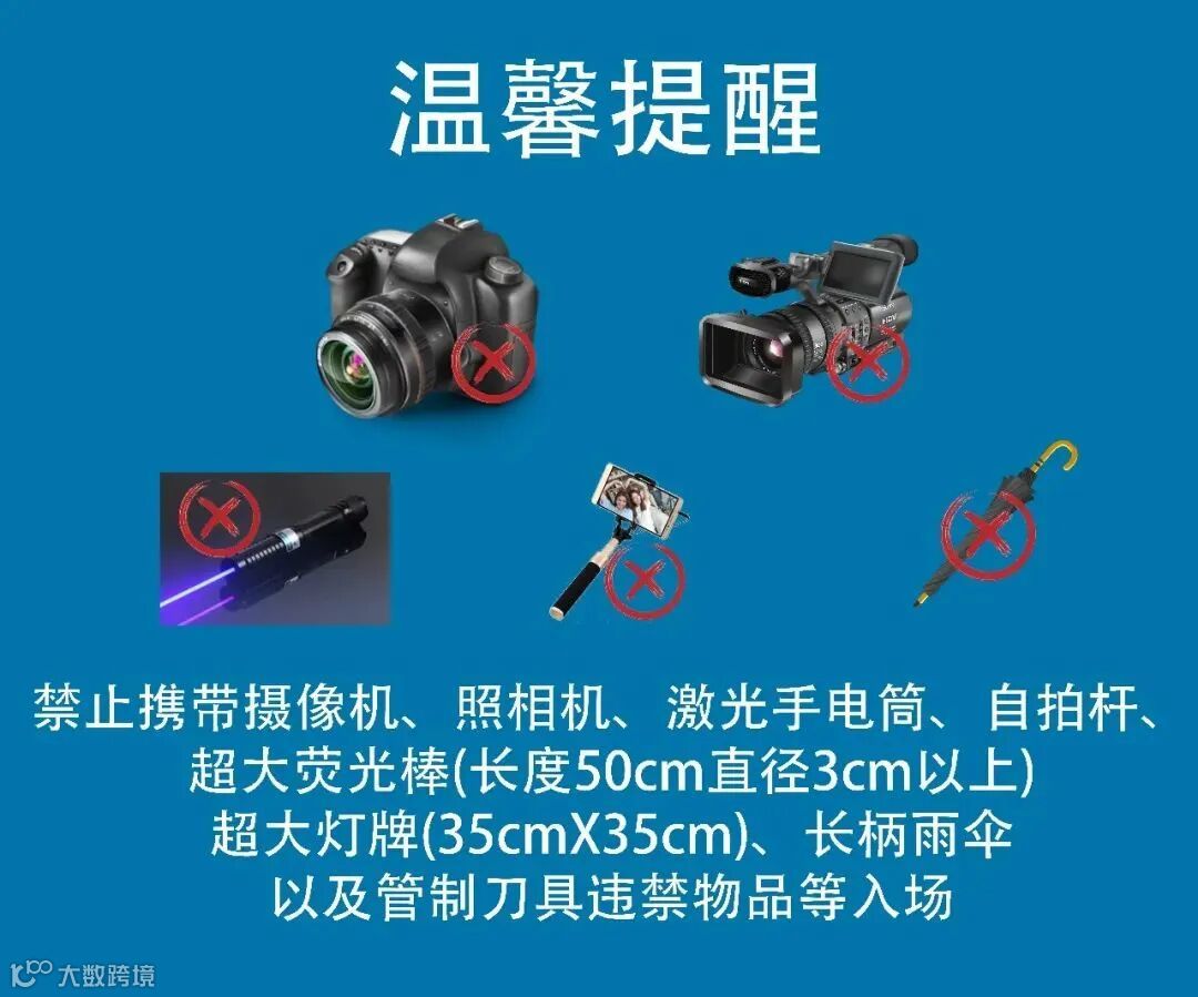 禁止携带气球、鼓掌拍,烟火棒、保温杯、长柄雨伞等带入场内;