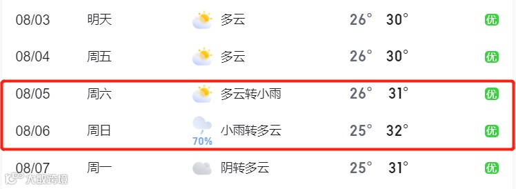 8月5-6日温度为25-32度,有雨水相伴,天气炎热,建议大家备好雨具,注意防暑降温。