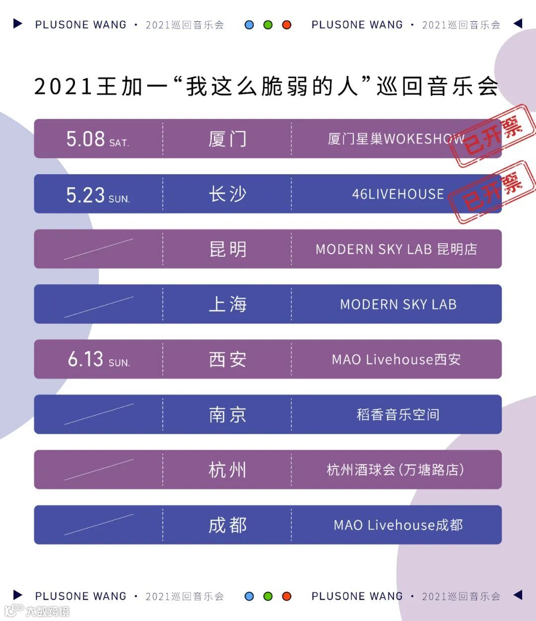 据悉,王加一的个人巡演也即将在全国范围内陆续开启。厦门、长沙均已开票。跟着台上少年唱少年,台下青春谓青春。届时欢迎大家来到现场,一起进入王加一的音乐世界中。