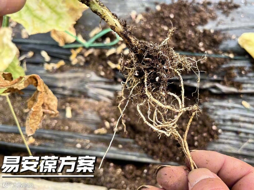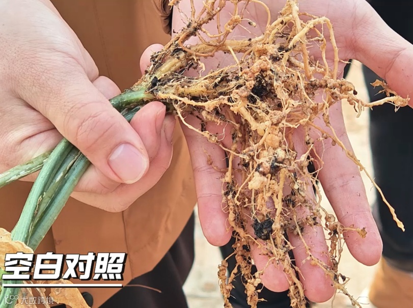 表示在防治前,棚内黄瓜线虫几乎全覆盖,采用易安葆防治线虫方案后,效果非常明显。并邀请参观人员随机挖取黄瓜苗,冲洗根部对比后发现处理区域的黄瓜生出大量粗白新根,根瘤根结数量极少;但CK 根系腐烂死亡,有瘤状凸起,地上部的叶片萎蔫,挂果稀少。