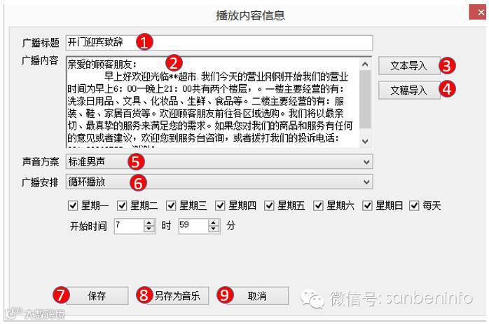 2. 广播内容,可以手动输入,也可以选择导入编辑好的文本或者系统内