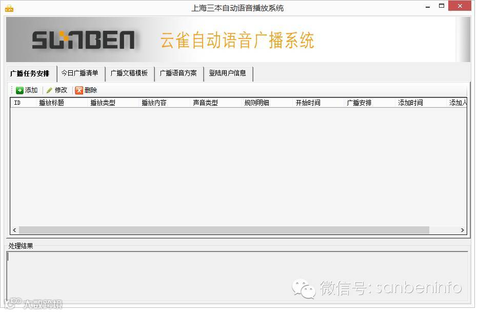 广播设置主界面如下:包括广播任务安排、今日广播清单、广播文稿模板、
