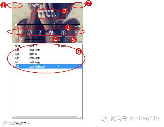 3. 音乐控制:依次为上一首、开始/暂停、下一首、赞、添加音乐、下次不再听