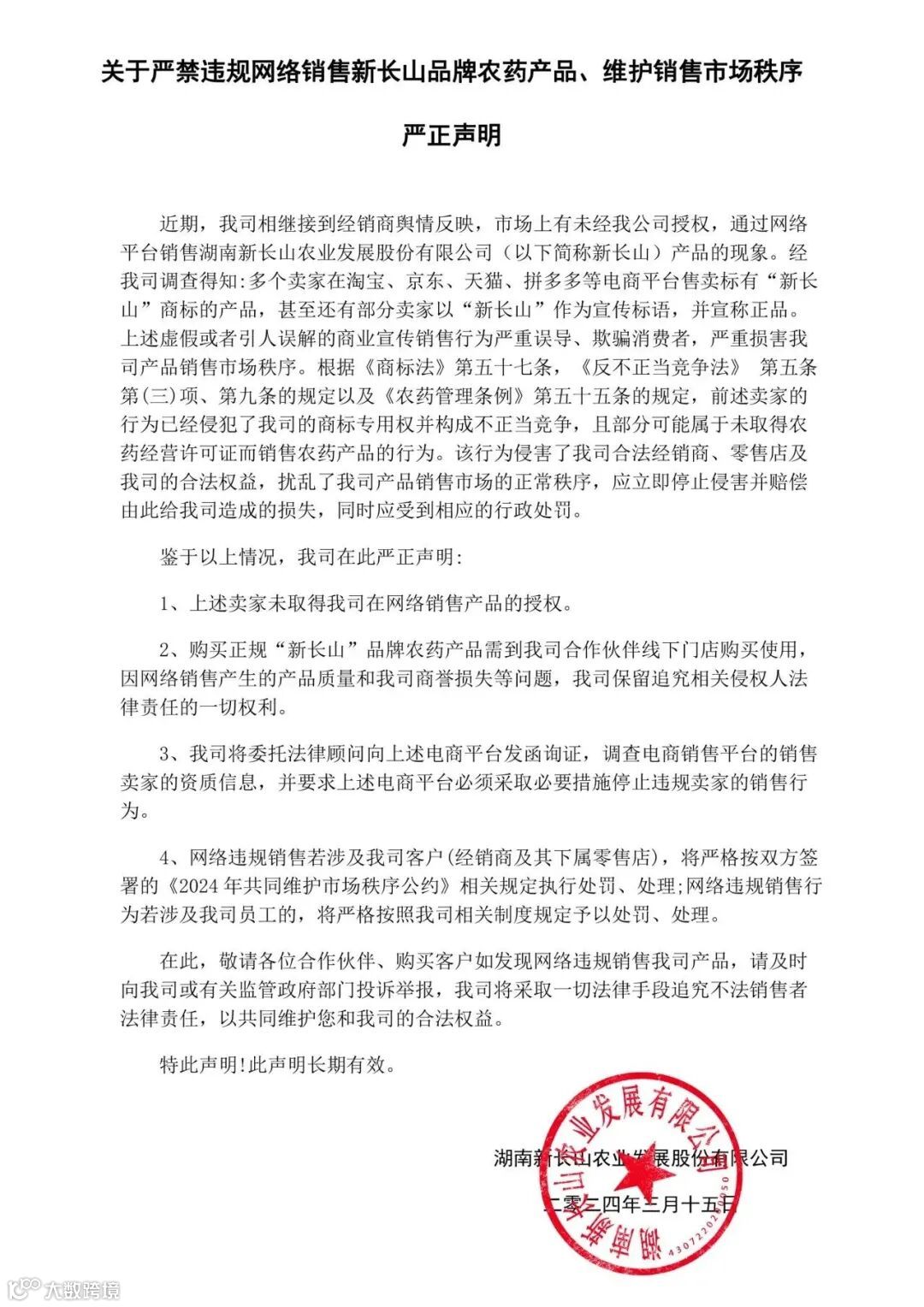 新长山集团坚持“呵护作物健康,共创丰收世界”的使命,谨记“诚信经营”的责任和义务,自觉维护安全健康的消费环境。