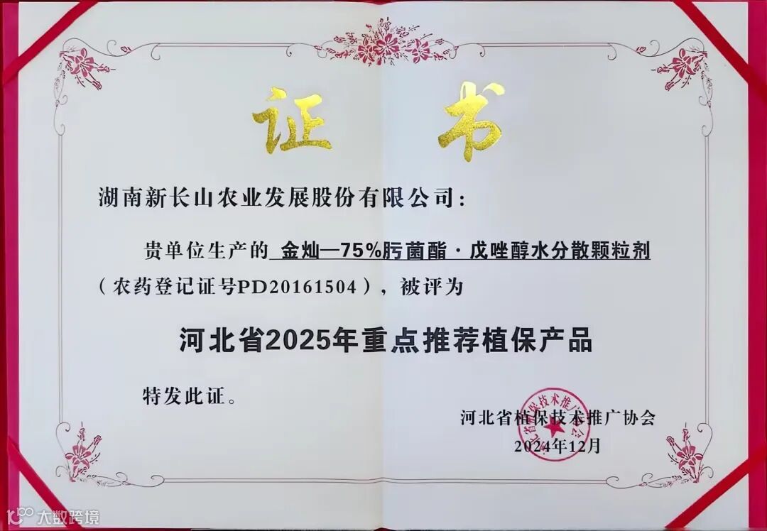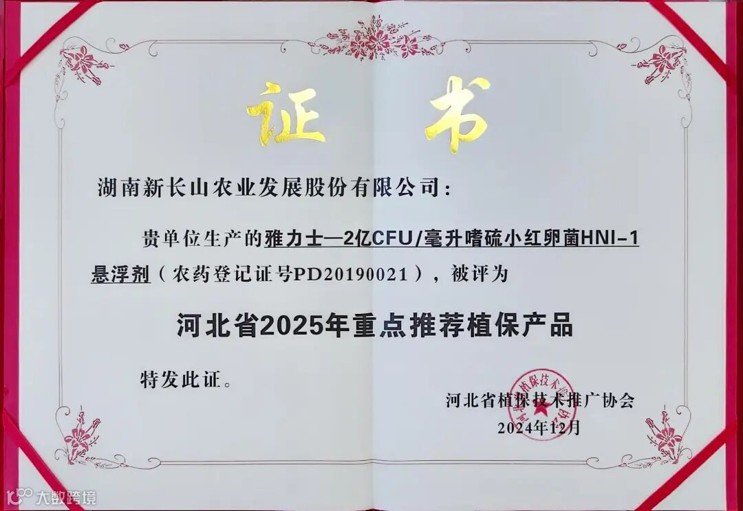 热烈祝贺湖南新长山集团两大战略产品——雅力士®(2亿CFU/毫升 嗜硫小红卵菌HNI-1),长山金灿®(75%肟菌·戊唑醇)入选“河北省2025年重点推荐产品”名录。