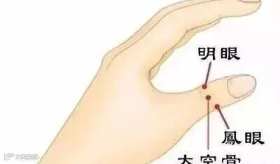 在我们的拇指上有三个相邻接的穴道,分别是明眼、凤眼、大空骨(如上图)。明眼、凤眼能够改善眼睛疲劳和急性结膜炎,大空骨则可改善一切有关眼睛的症状。平时眼睛容易疲劳的人,每天要刺激这三个穴道两次。