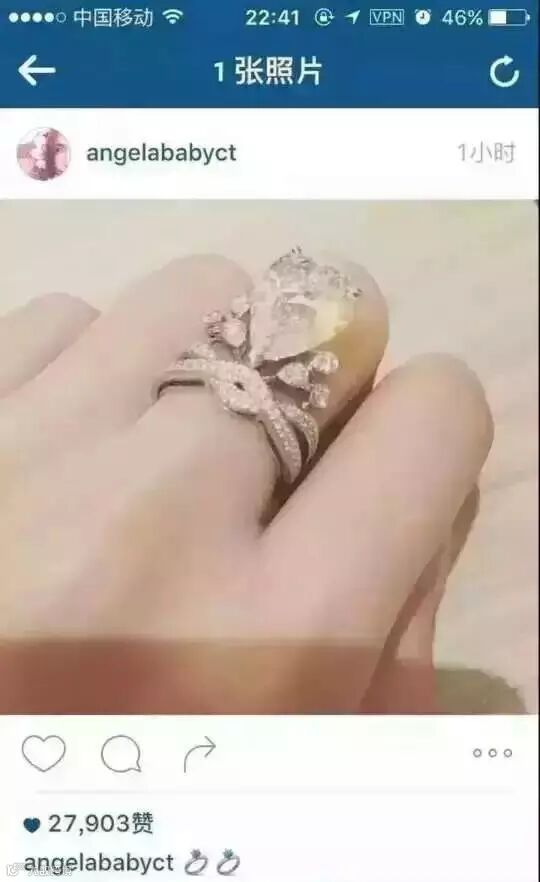 早在9月28日,baby就在ins上晒出了一枚超炫的大钻戒,据媒体报道称“这只钻戒镶有1颗5.53克拉梨形 DIF级美钻,以及73颗明亮式切割钻石,价值千万”。