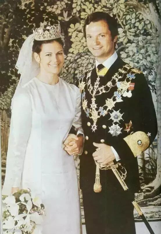 1976年西尔维娅皇后与瑞典国王卡尔十六世古斯塔夫大婚,佩戴CHAUMET珍珠浮雕皇冠