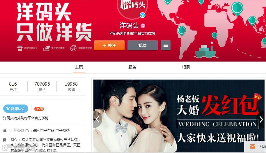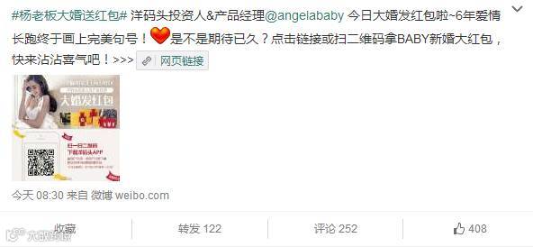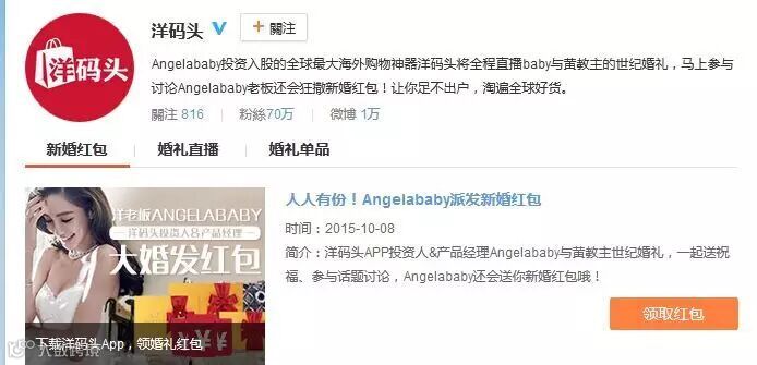其官微一大早就开始发布相关博文,设置新首页,并发起#杨老板大婚发红包#的话题,鼓励网友下载洋码头APP领红包。